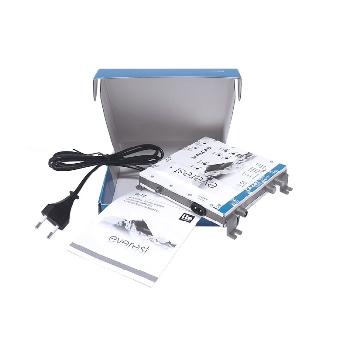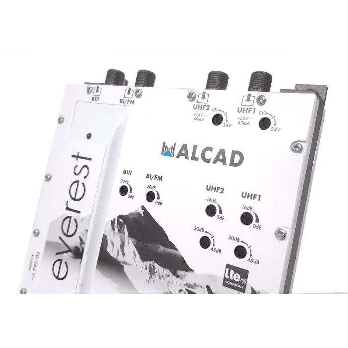 5G LTE domovní zesilovač. 1x vstup BI/FM / 1x vstup BIII/DAB, 2x vstup UHF / 1x výstup + 1x test, zesílení 32 dB (BI/FM/BIII/DAB), 45/30 dB (UHF), max.výstupní úroveň 117 dBµV, napájení předzesilovače 24V / 60 mA.
