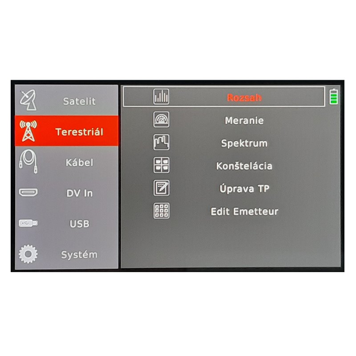 Měřící přístroj pro měření DVB-S/S2/T/T2/C/C2 signálu. Podporou kodeku HEVC/H.265 včetně zobrazení vysílání na displeji. Slovenské menu, 5" AMOLED displej, ovládání tlačítky na panelu.
