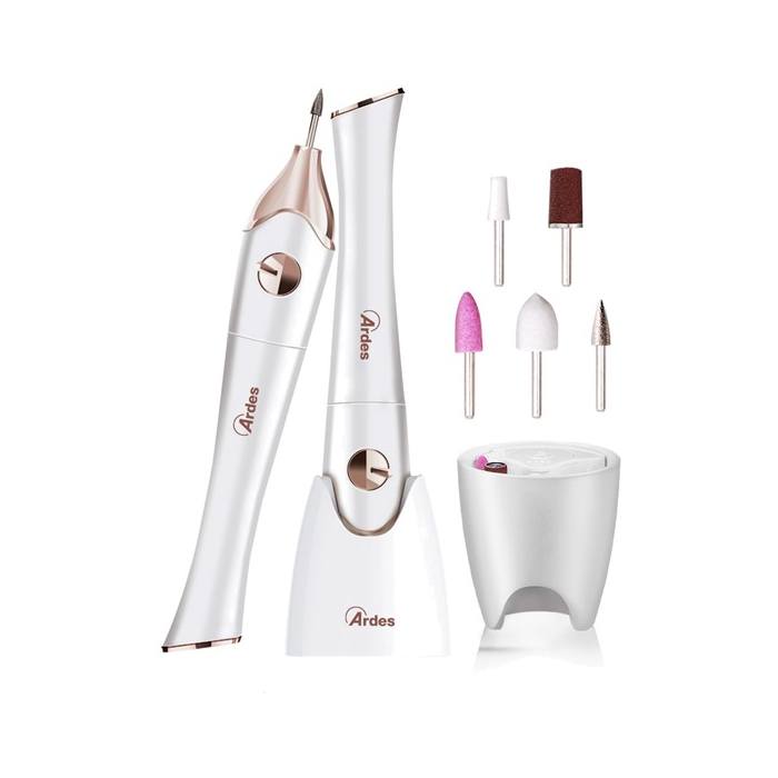 Manikúra a pedikúra set s UV lampou k vytvrzení laku; Elegantní, kompaktní a snadno použitelné; Vysokorychlostní motor; 5 vyměnitelných nástavců: odstranění nehtové kůžičky, leštící nástavec, tvarovací nástavec, pilovací nástavec a vyhlazovací nástavec, Pohodlná základna ke skladování nástavců