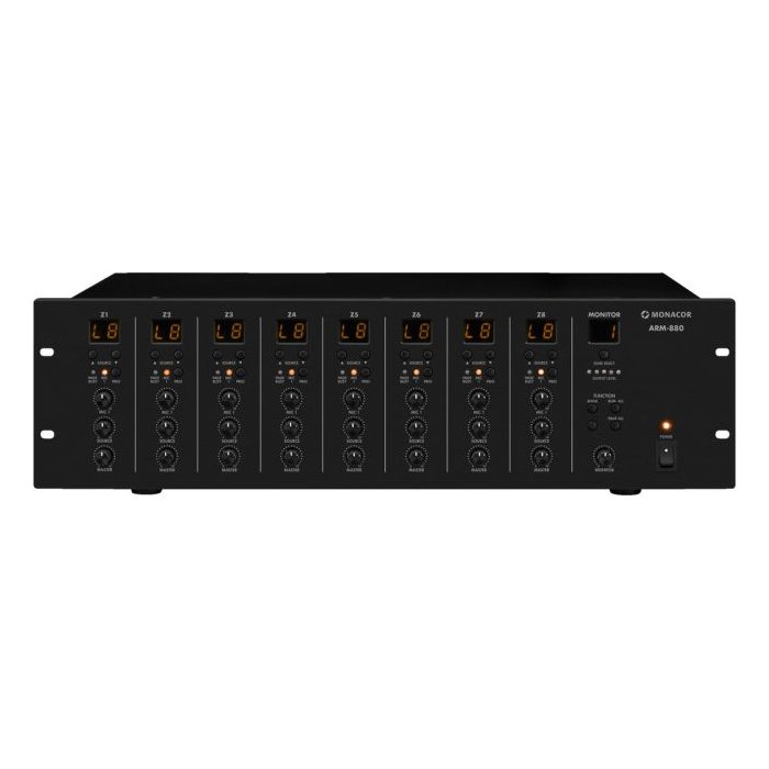 Systém ARM-880... od MONACOR je flexibilné PA riešenie pre viaczónové použitie. Je ideálny pre použitie v hoteloch, reštauráciách a baroch, v konferenčných miestnostiach, školách, športových a fitnes centrách. Osem rôznych audio zdrojov, napr. CD prehrávačov, SAT prijímačov, rádio programov je možné distribuovať do 8 výstupných zón a priradiť podľa potreby.