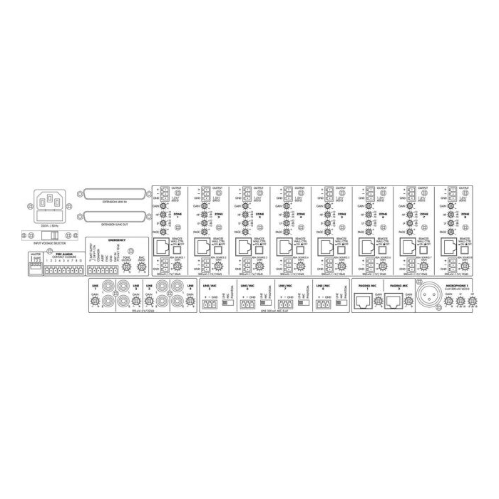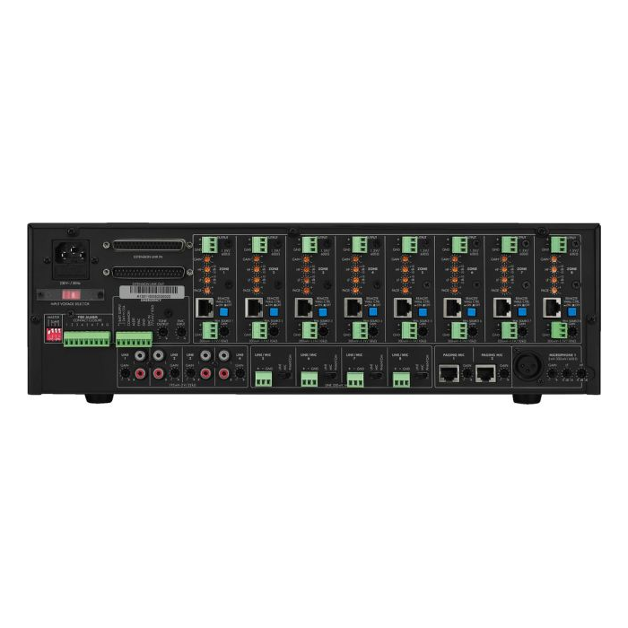 Zapojením master/slave je možné rozšíriť systém až na 32 výstupných zón. Dostupné sú rôzne signálne alarmy a lokálne mikrofóny.