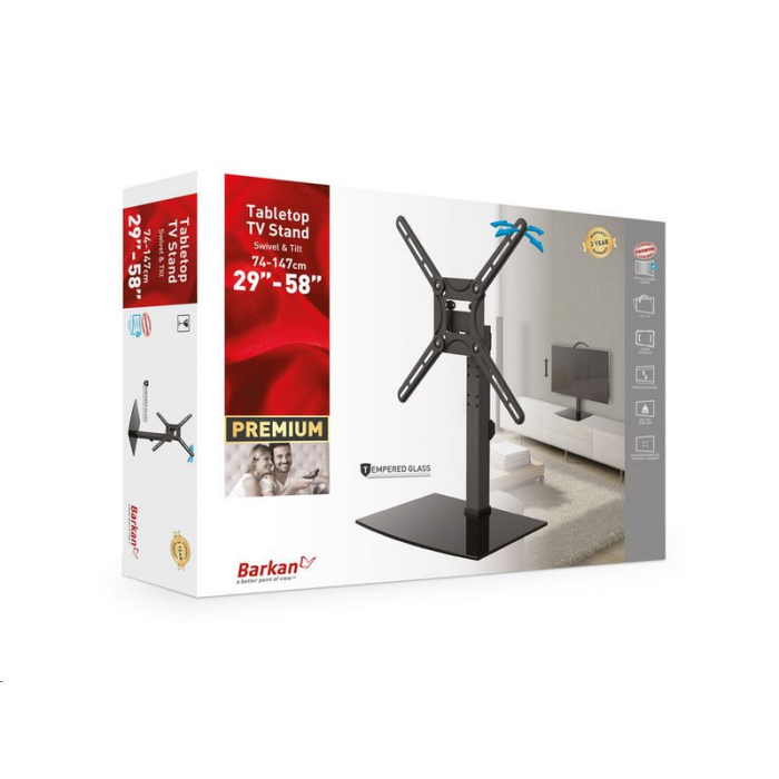 Elegantní stojan pro TV, nahradí původní nožičky televizoru. Lze natáčet, naklápět a vysouvat nahoru dolů, nosnost do 25 kg, pro televizory od 29“ do 58“, luxusní provedení - pevné temperované sklo.