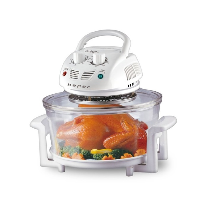 multifunkční, 2 funkce: grilování, smažení, objem 12 l - 18 l (s nastavcem), termostat (100-250°C), časovač, topné spirály z oceli, žáruvzdorná kovová základna, příkon 1400 W, barva stříbrná