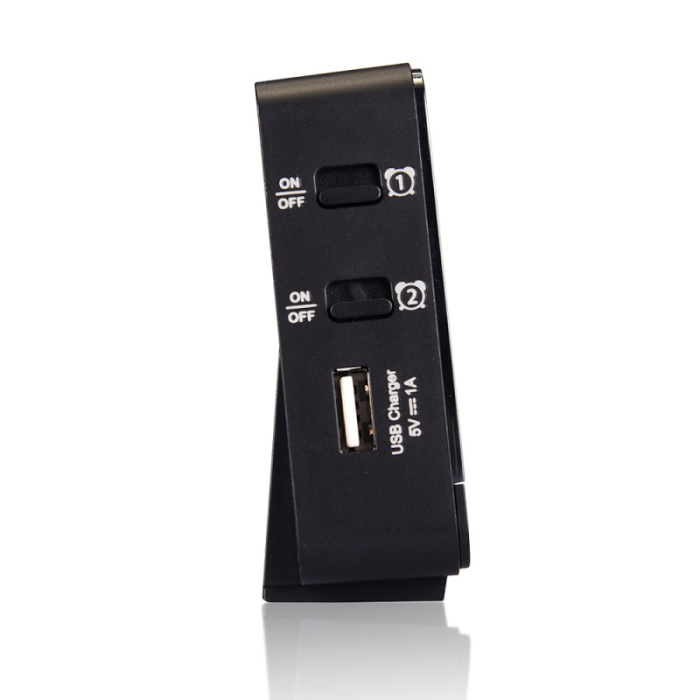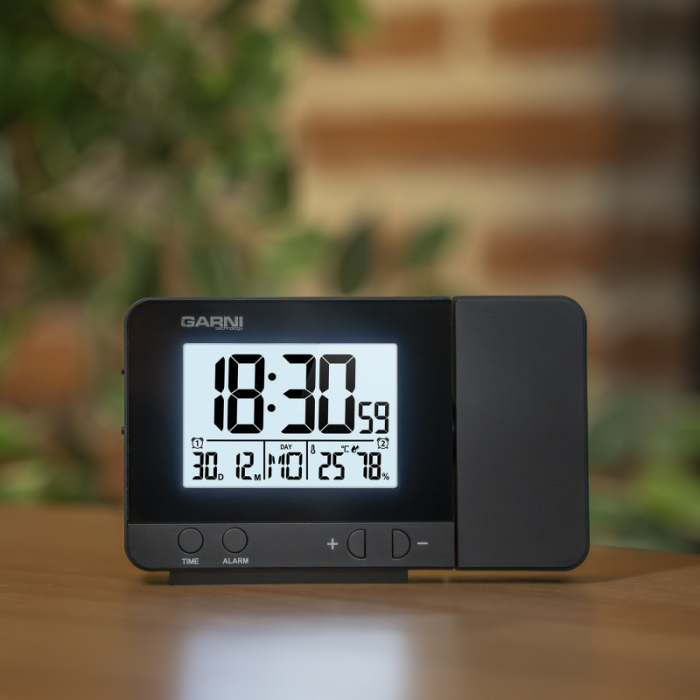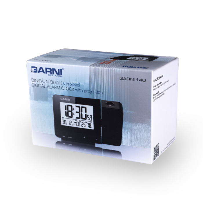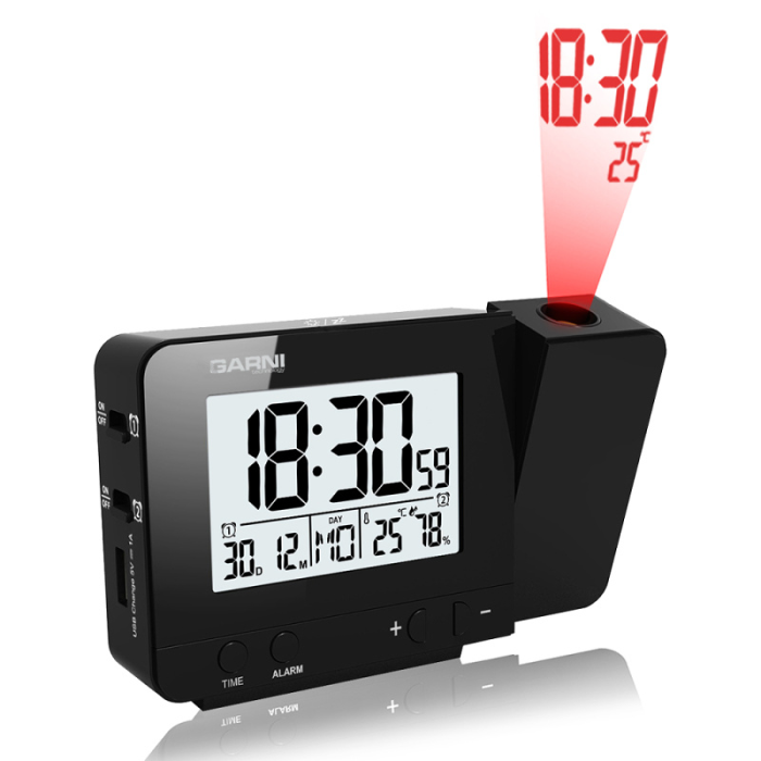 Budík s projekcí času a vnitřní teploty s LCD displejem. Čas řízeným rádiovým signálem DCF-77, měření vnitřní teploty a relativní vlhkosti, USB port (1A) pro nabíjení externích zařízení.