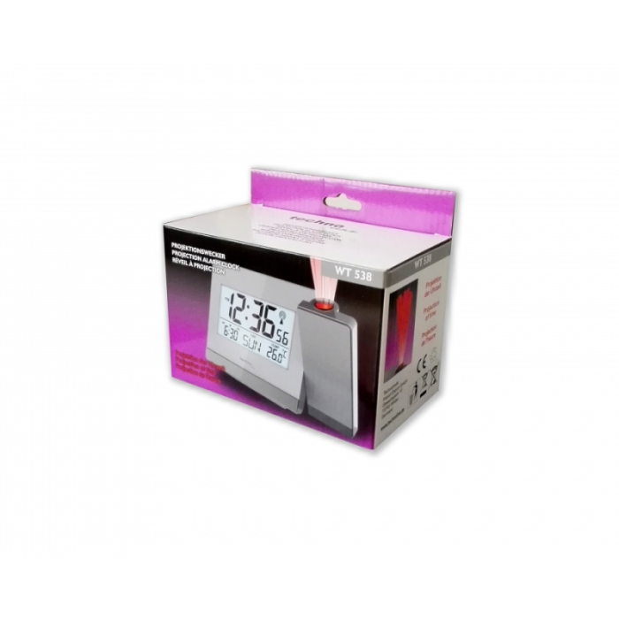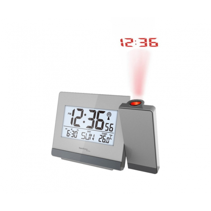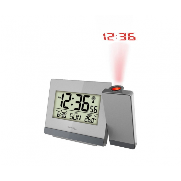 Digitální budík s projekcí a měřením vnitřní teploty. Možnost vypnutí displeje i projekce, čas řízený rádiovým signálem DCF-77, budík s funkcí opakovaného buzení Snooze.