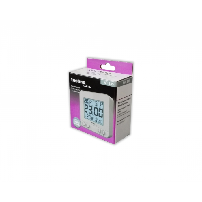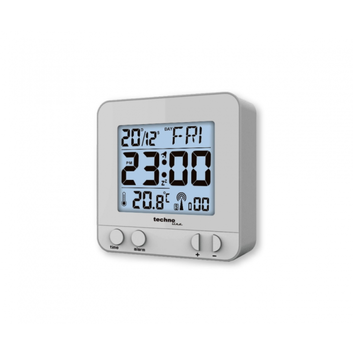 Elegantní digitální budík s časem řízeným rádiovým signálem DCF-77. Opakované buzení po 5 minutách, buzení zvukovým signálem, měření vnitřní teploty, krátkodobé podsvícení displeje.