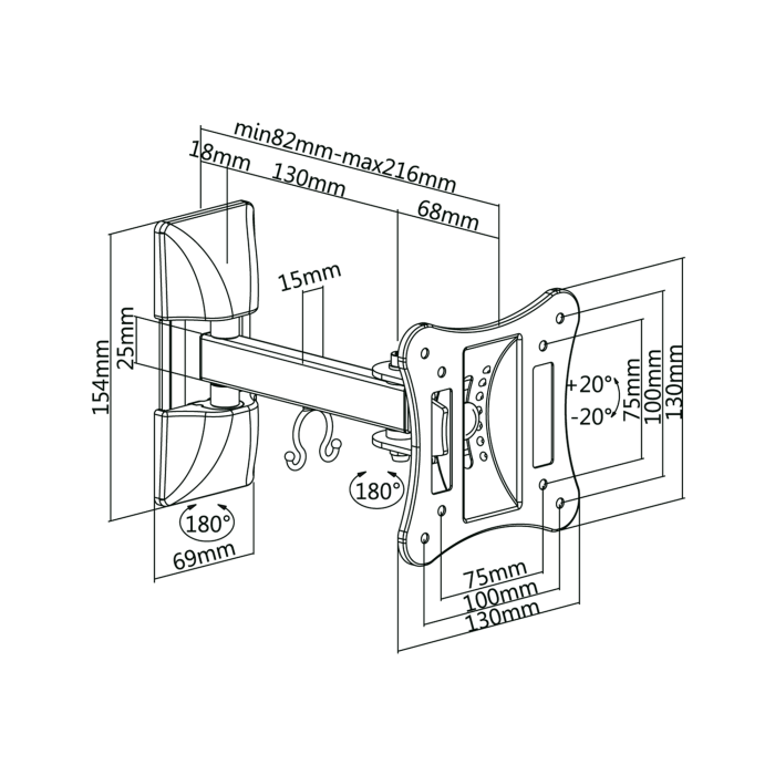 Univerzální nastavitelný ocelový držák pro LED/LCD televizory a monitory o velikosti úhlopříčky 13“-27“. Max. nosnost 15kg, vzdálenost od stěny 82 - 216 mm, max. VESA 100 x 100 mm.