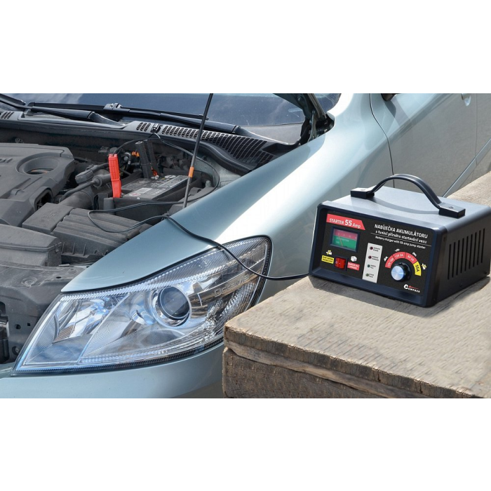 Funkce STARTER 55 Amp umožňuje nastartovat vozidlo s vybitou baterií tak, jako kdy bylo startováno pomocí startovacích kabelů z jiného vozidla.