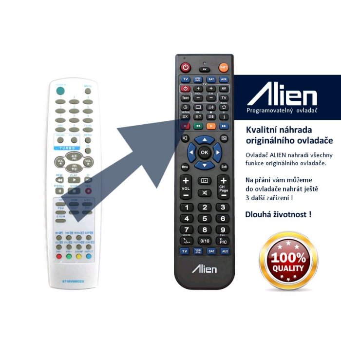 Ovladač ALIEN 4v1 lze naprogramovat až na 4 přístroje. Znamená to, že můžete jedním ovladačem ovládat současně satelitní přijímač, televizor nebo třeba DVD. Chcete-li objednat ovladač naprogramovat ještě další zařízení, napište nám do objednávky do poznámky přesný typ zařízení dálkového ovládání vašeho zařízení.