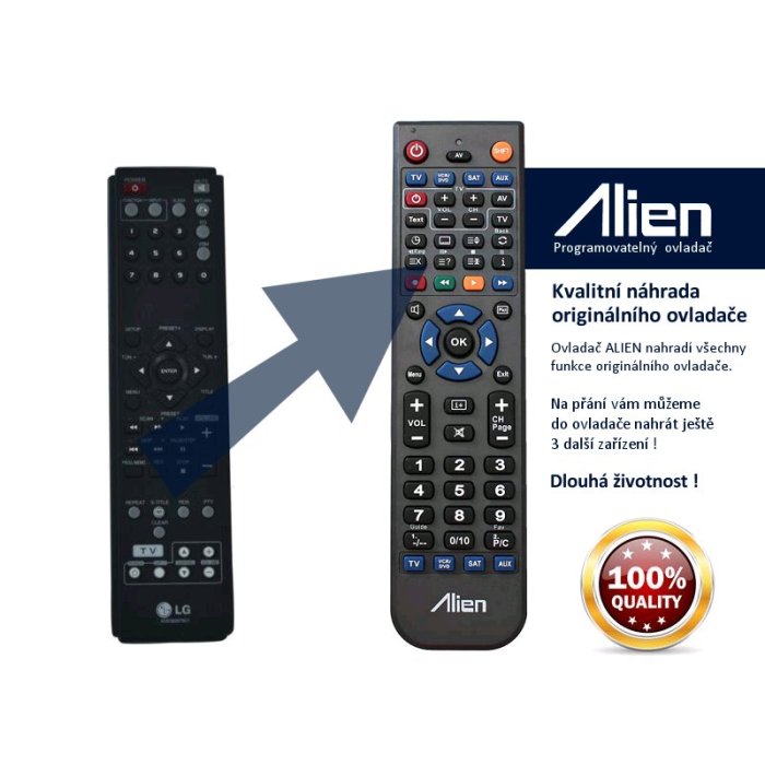 Ovladač obdržíte naprogramovaný na vaše zařízení. ALIEN nahrazuje všechny funkce originálního ovladače.