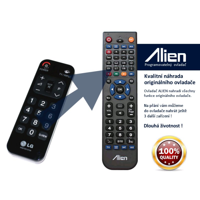 Ovladač obdržíte naprogramovaný na vaše zařízení. ALIEN nahrazuje všechny funkce originálního ovladače.