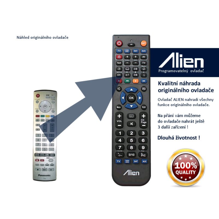 Dálkový ovladač ALIEN 4v1 umí současně ovládat až 4 přístroje, pokud nám tedy spolu s objednávkou pošlete modely vašich zařízení, tak vám ho můžeme naprogramovat podle vašich potřeb.