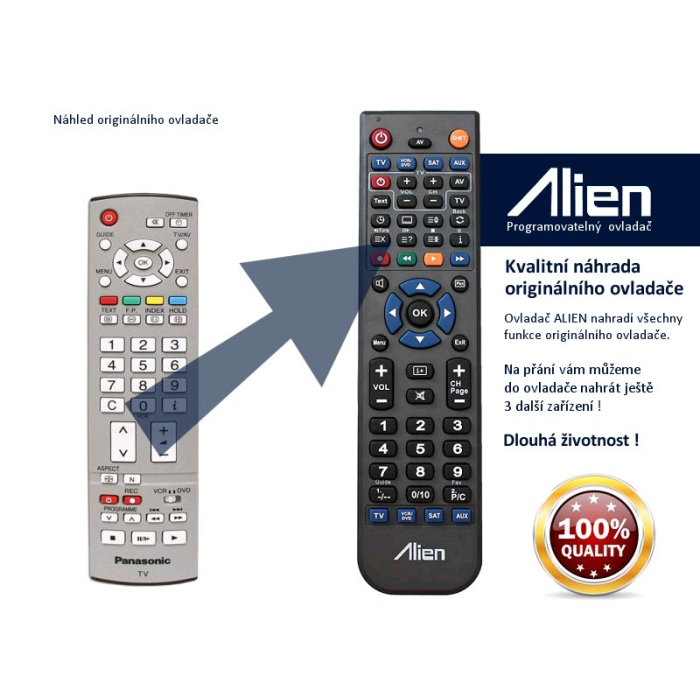 Dálkový ovladač ALIEN 4v1 umí současně ovládat až 4 přístroje, pokud nám tedy spolu s objednávkou pošlete modely vašich zařízení, tak vám ho můžeme naprogramovat podle vašich potřeb.