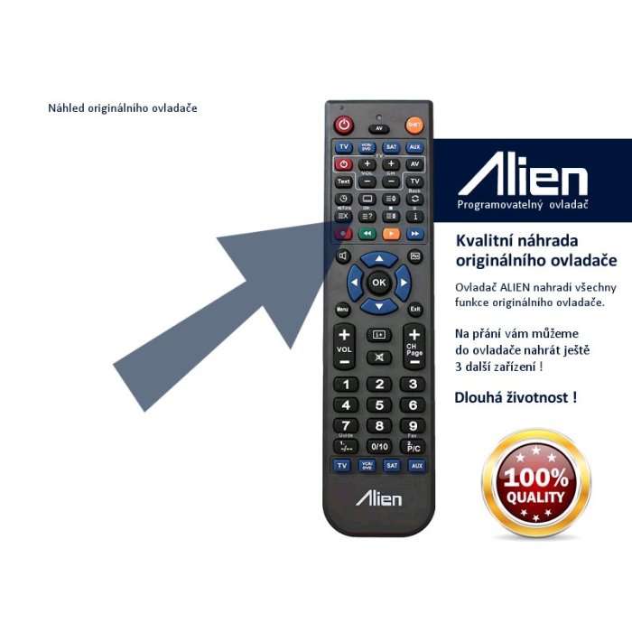 Dálkový ovladač ALIEN 4v1 umí současně ovládat až 4 přístroje, pokud nám tedy spolu s objednávkou pošlete modely vašich zařízení, tak vám ho můžeme naprogramovat podle vašich potřeb.