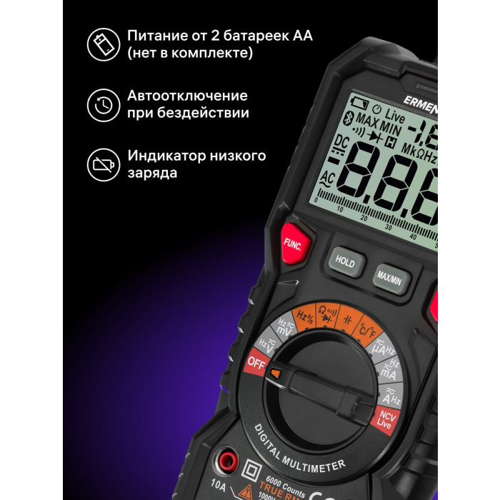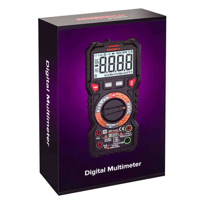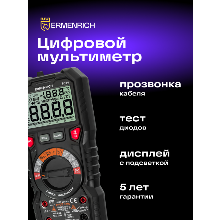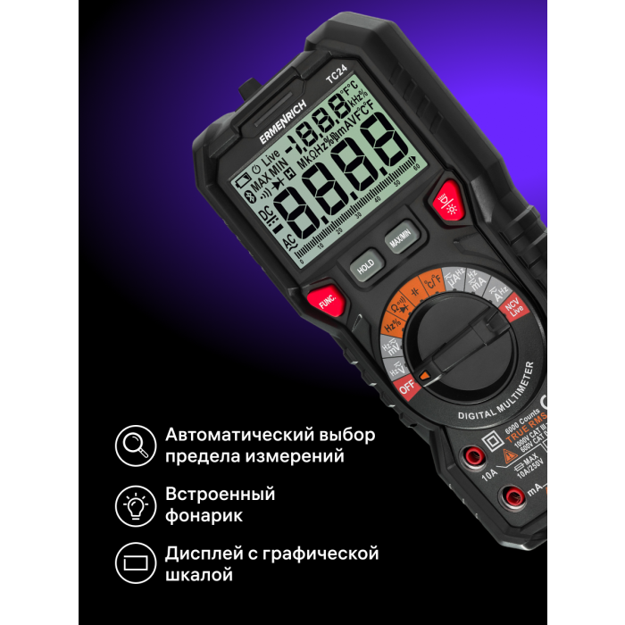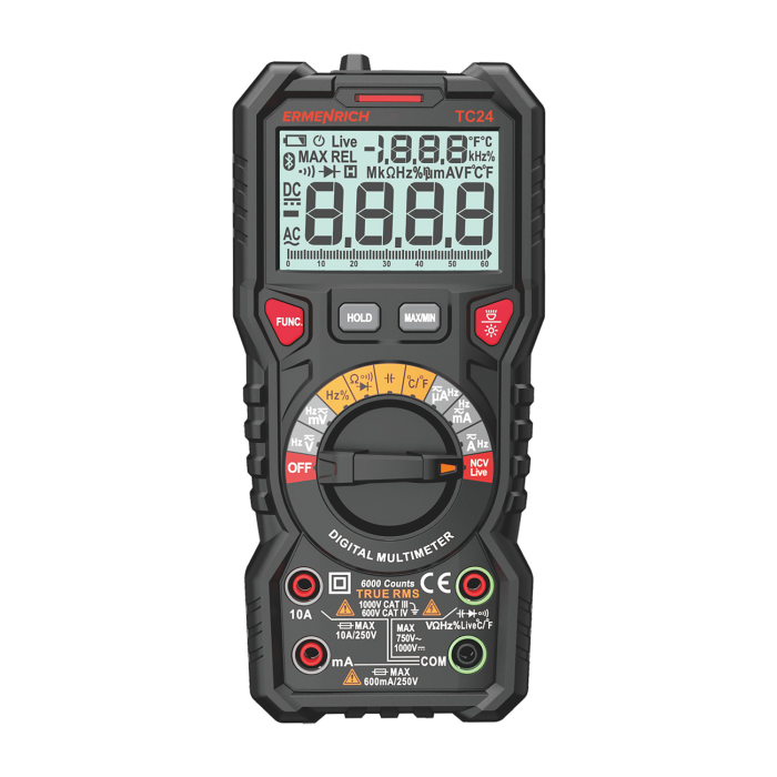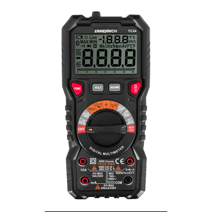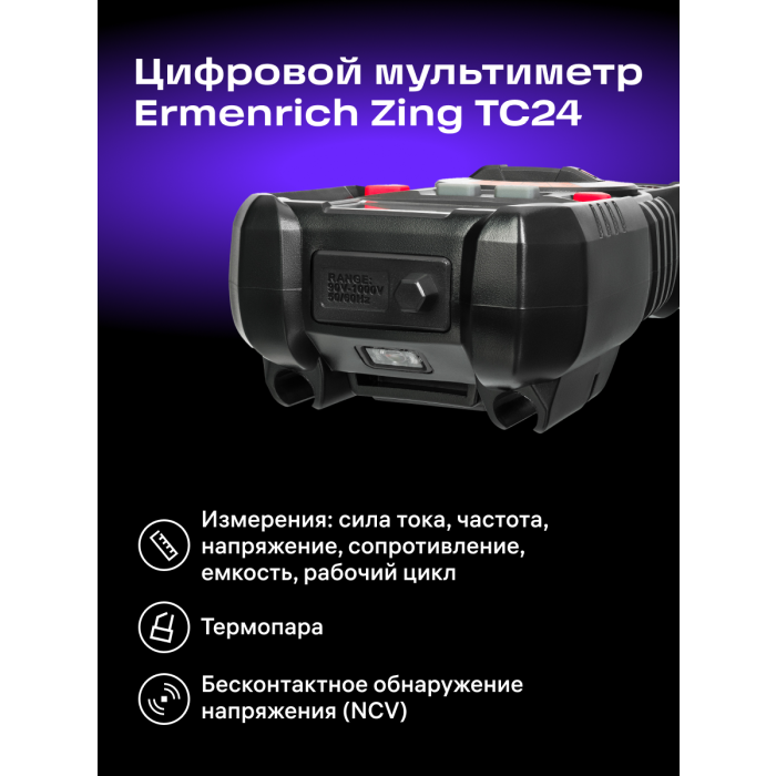 Digitální multimetr Ermenrich Zing TC24 je profesionální přístroj pro testování elektrických sítí a zařízení a měření parametrů, jakož i měření takových parametrů, jako je odpor, napětí, proud, pracovní cyklus, frekvence, kapacita a teplota. Výpočet skutečné efektivní hodnoty zajišťuje vysokou přesnost měření. Automatická volba mezních hodnot měření usnadňuje používání přístroje. Multimetr je kompaktní a spolehlivý přístroj napájený standardními bateriemi.