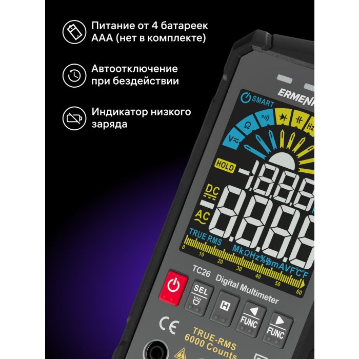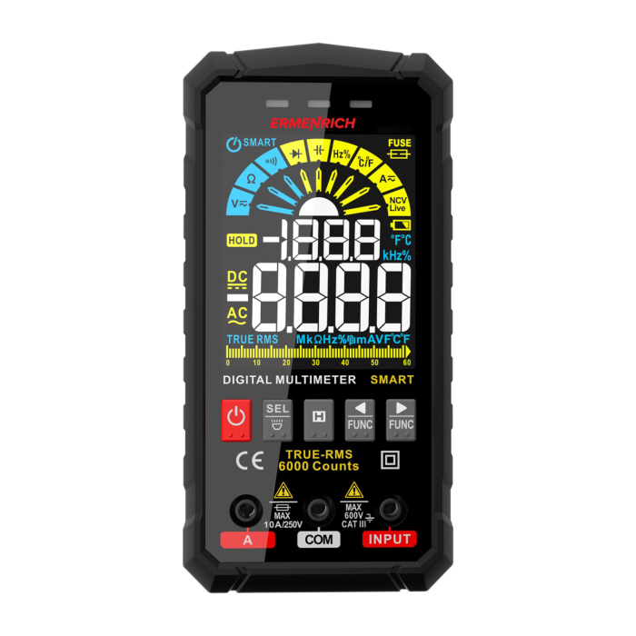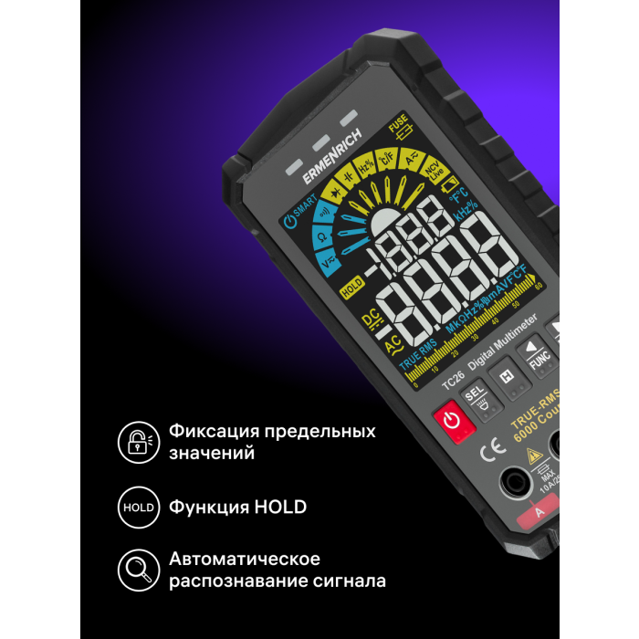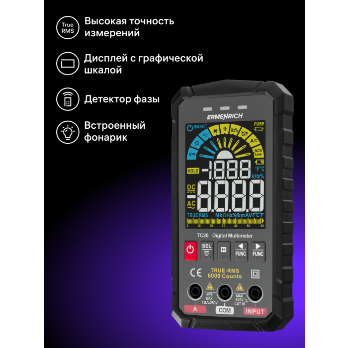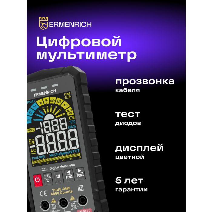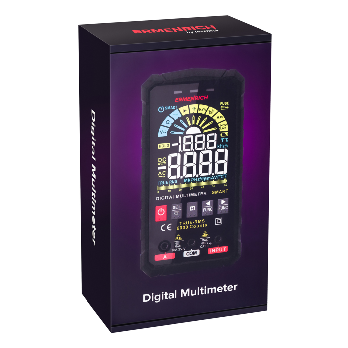 Digitální multimetr Ermenrich Zing TC26 je elektrický měřicí přístroj True RMS s voltmetrem, ampérmetrem, ohmmetrem, měřičem frekvence, kapacity, pracovního cyklu a termočlánkovým snímačem. Poskytuje skutečný výpočet efektivní hodnoty proměnných, a proto je velmi přesný. Přístroj je vhodný pro plnění profesionálních úkolů technika pracujícího s elektrickým zařízením a elektrickými sítěmi, ale je vhodný i pro kutily.