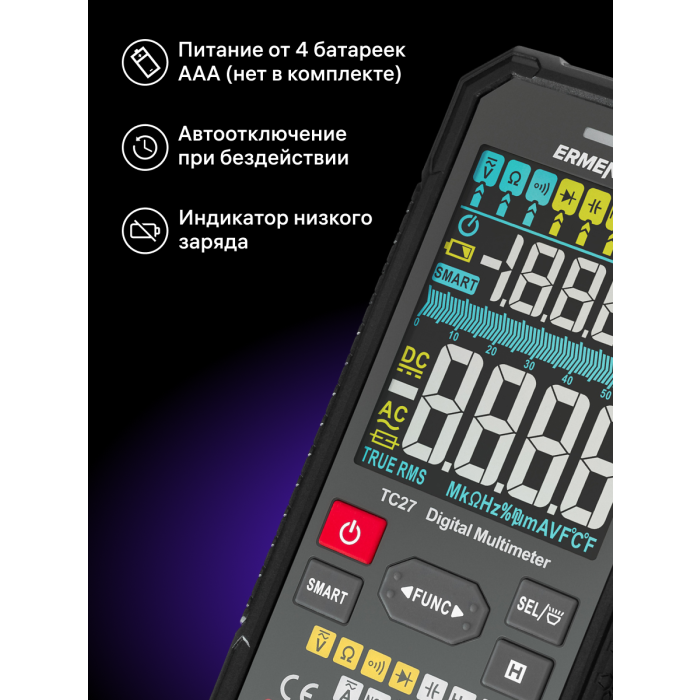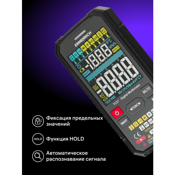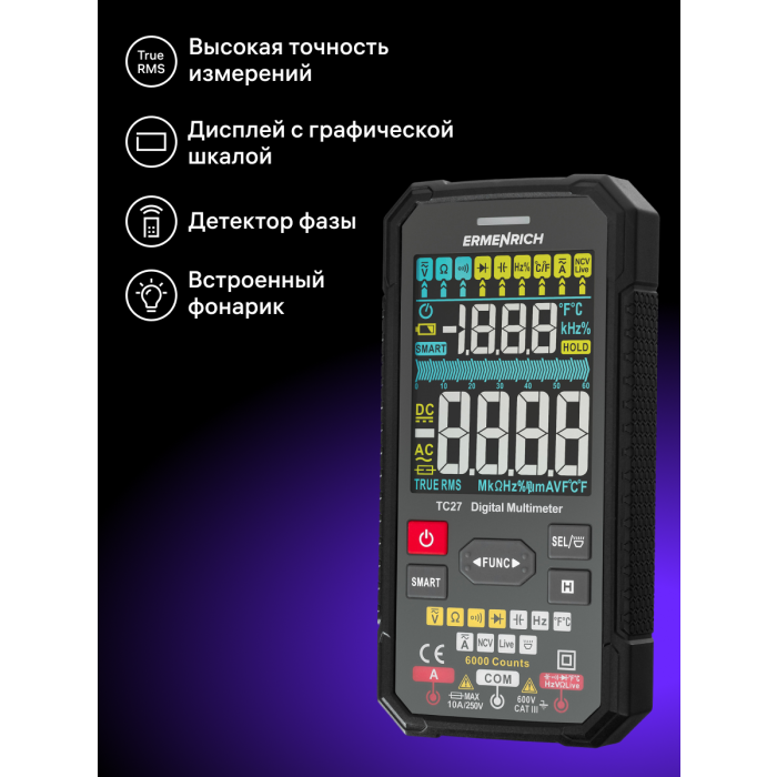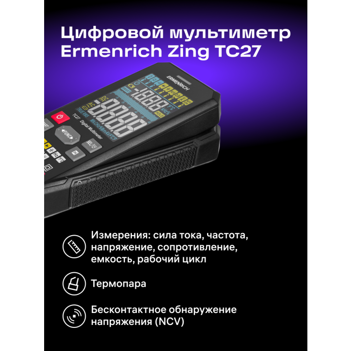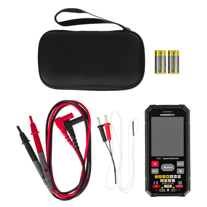 Digitální multimetr Ermenrich Zing TC27 se používá k testování elektrických zařízení a elektrických obvodů. Jeho široká funkčnost vám umožní používat jej nejen doma, ale i pro profesionální práci. Multimetr je vynikající volbou pro mechaniky, elektrikáře, opraváře a další technické pracovníky. Multimetr Ermenrich Zing TC27 je přístroj True RMS, který zaručuje vysoce přesná měření nesinusových signálů.