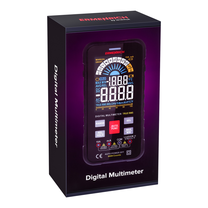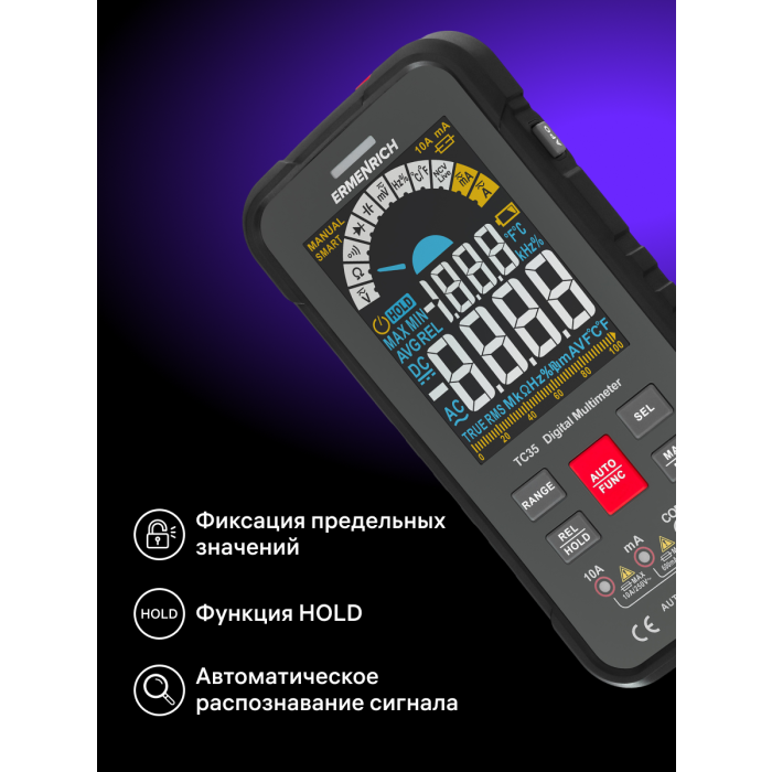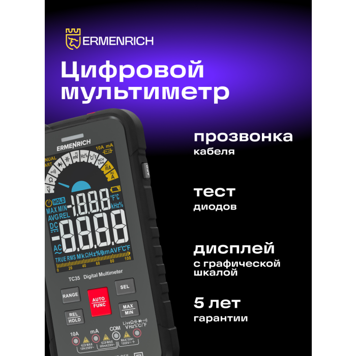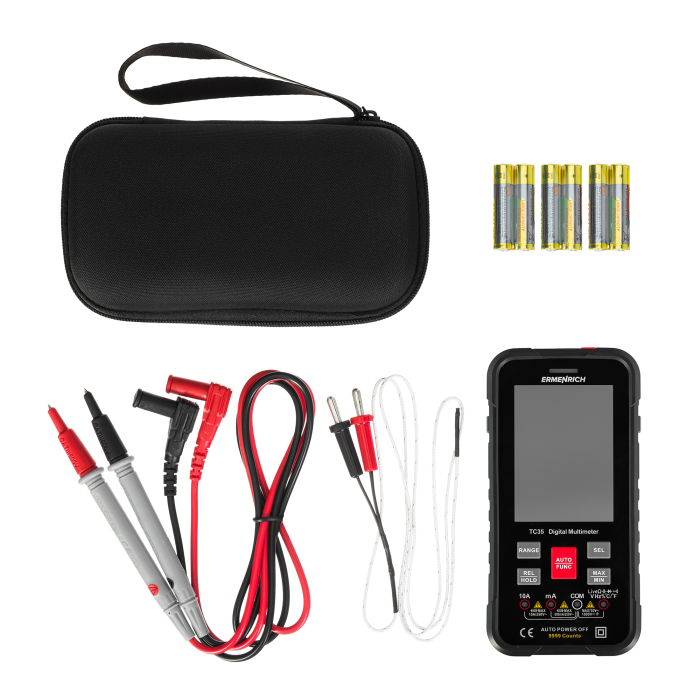 Digitální multimetr Ermenrich Zing TC35 kombinuje funkce několika elektrických měřicích přístrojů: voltmetru, ampérmetru, ohmmetru, měřiče kapacity a měřiče frekvence. Dokáže měřit pracovní cyklus a určovat teplotu. Mezní hodnotu měření lze zvolit ručně nebo automaticky. Multimetr je kompaktní a lehký přístroj, který má barevný displej s číslicemi a grafickou stupnici. Podsvícení displeje a vestavěná svítilna usnadňují práci v prostředí se slabým osvětlením.