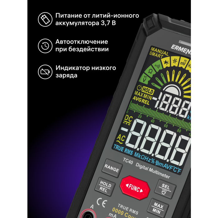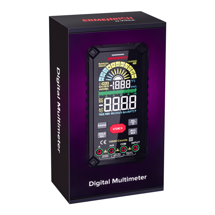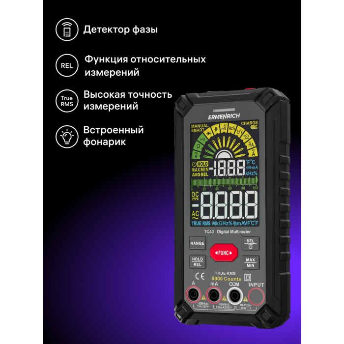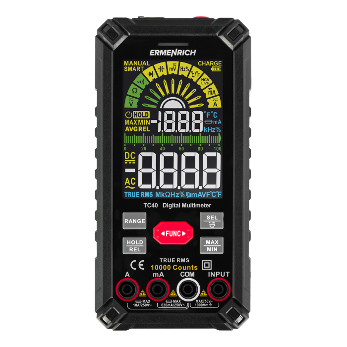 Digitální multimetr Ermenrich Zing TC40 měří následující charakteristiky: proud, napětí, odpor, frekvenci, kapacitu. Disponuje také funkcemi pro měření pracovního cyklu a teploty. Diagnostické funkce zahrnují test diod, test kontinuity, detekci fáze a bezkontaktní detekci vysokého napětí (NCV). Pomocí funkce přidržení zobrazení naměřené hodnoty můžete uchovat naměřené údaje na displeji.