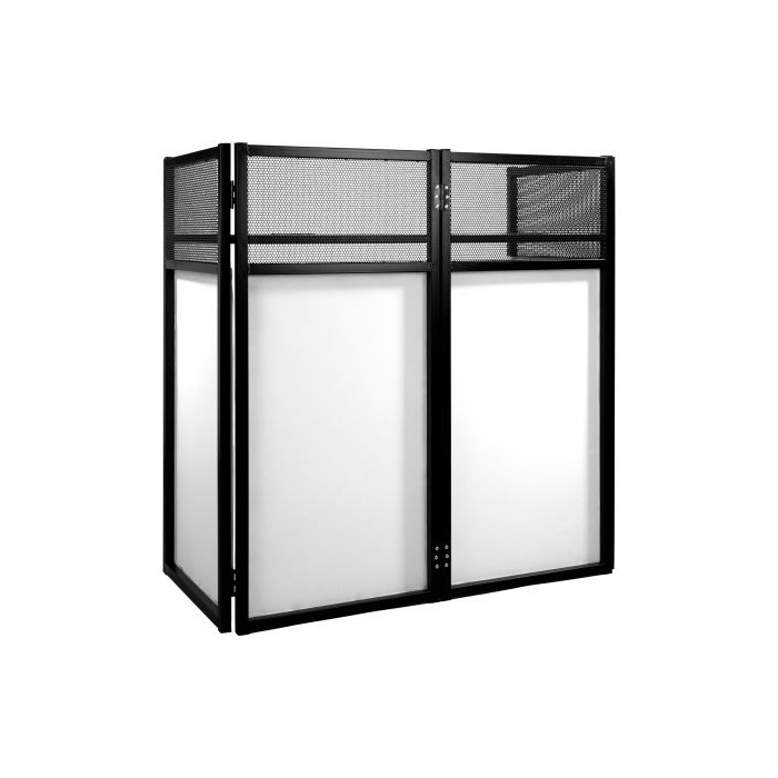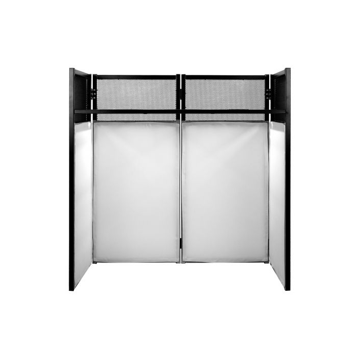 DJ Desk stand allowing you to install your DJ equipment professionally and hide your control room. This all-in-one solution is ideal for any facilitator looking for a system that is easy to set up and transport. White lycras and metal table.