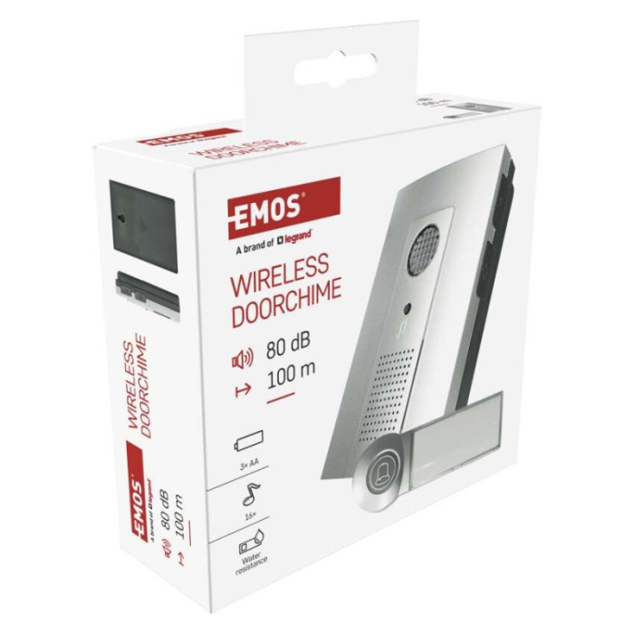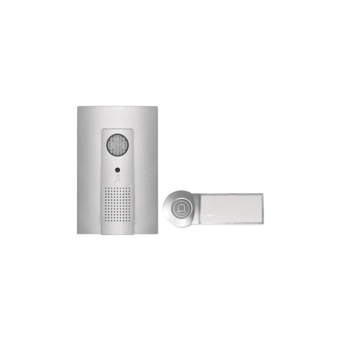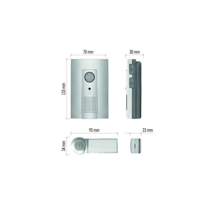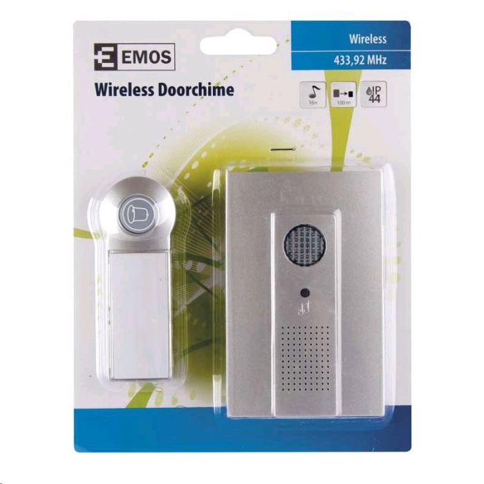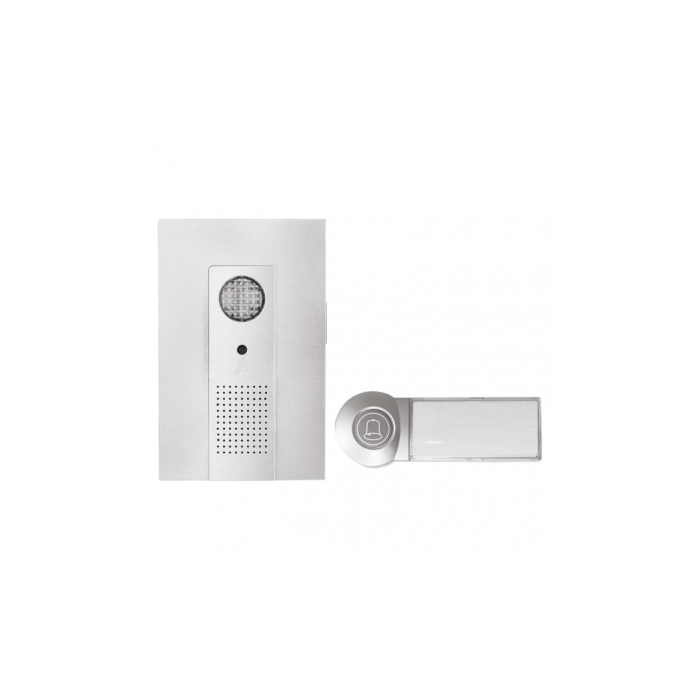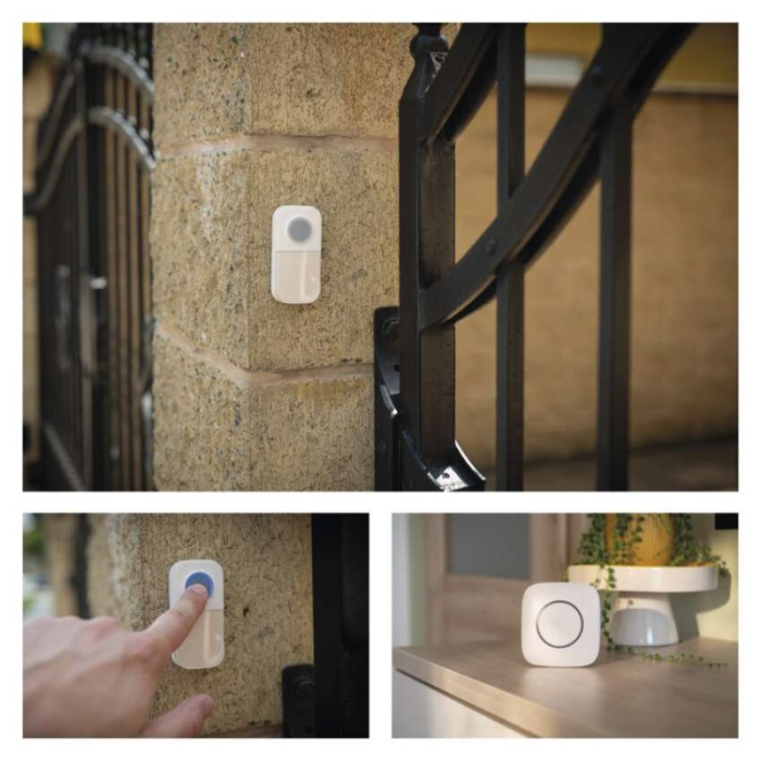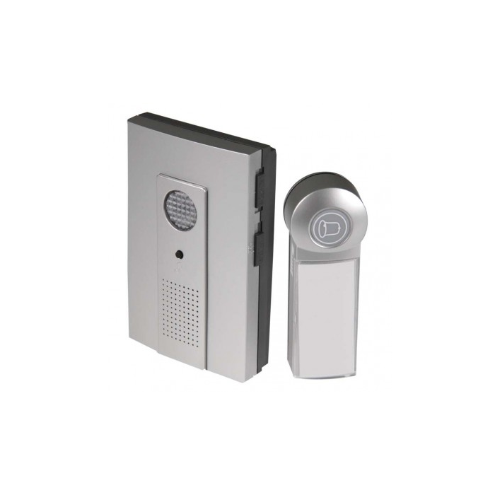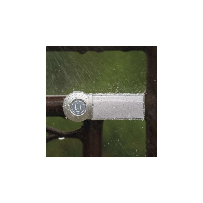 Bezdrátový bateriový domovní zvonek s dosahem až 100m. Nastavitelná hlasitost vyzvánění, možnost nastavit 3 různé druhy provozu: pouze zvuková signalizace, pouze světelná signalizace, zvuková a světelná signalizace.