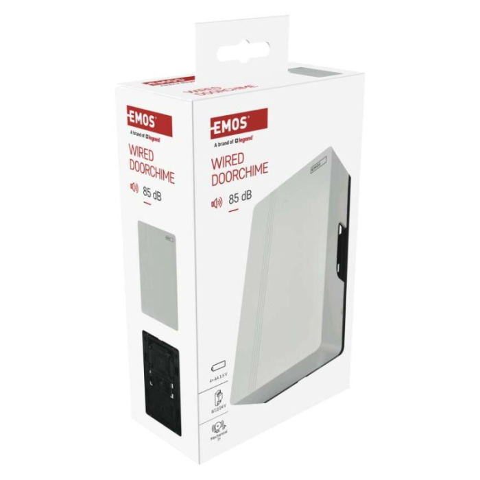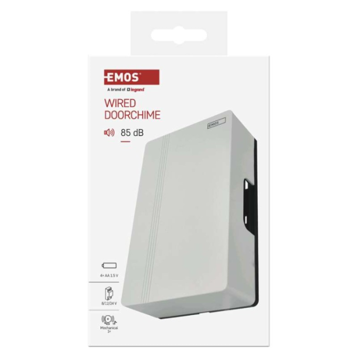 Drátový zvonek EMOS P57102 – spolehlivý pro domácnost i kancelář. Napájení 4× AA nebo 8–24 V AC/DC, hlasitost 85 dB, jednoduchá montáž, krytí IP20.
