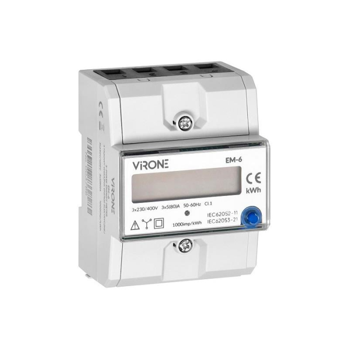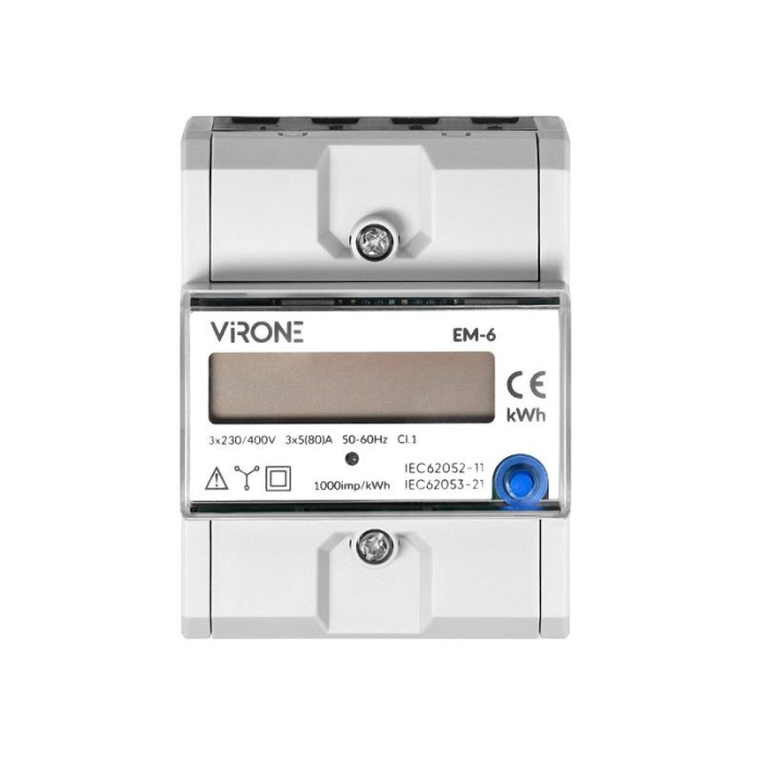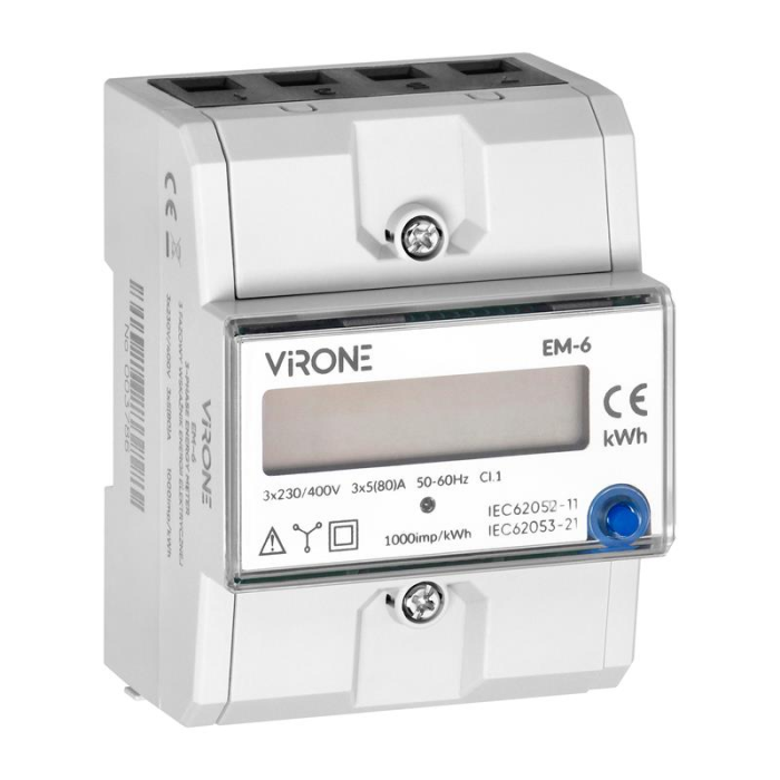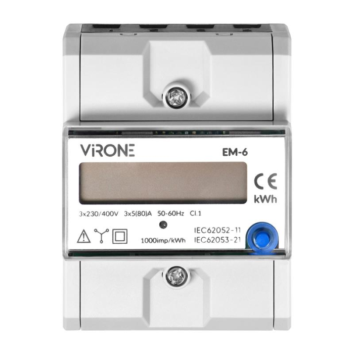 VIRONE EM-6 elektroměr 3F na DIN lištu s MID certifikátem, jmenovité napětí 3x 230V/400V, 50/60Hz, podsvícený displej, 80A