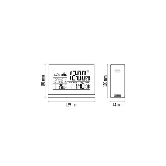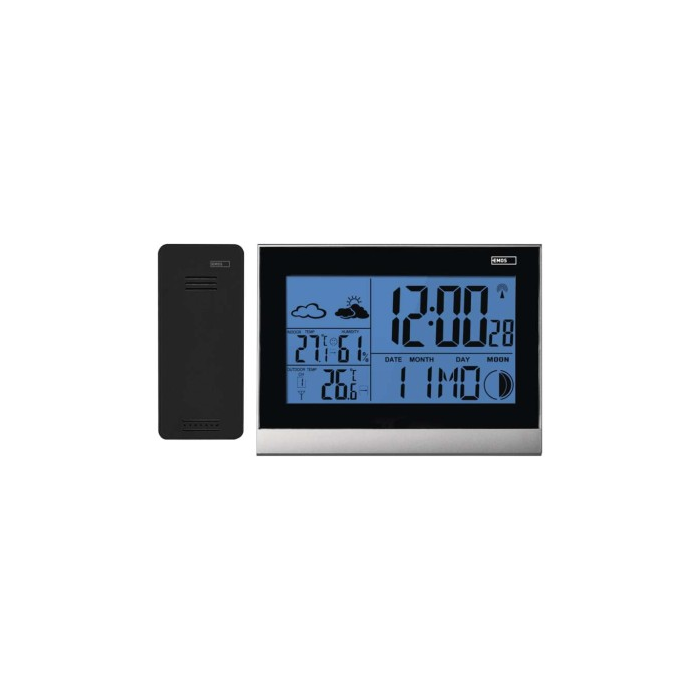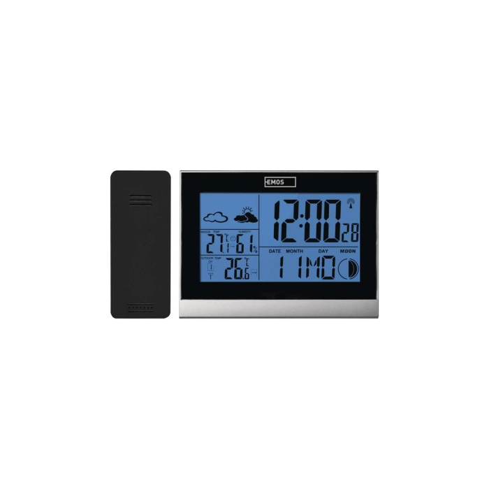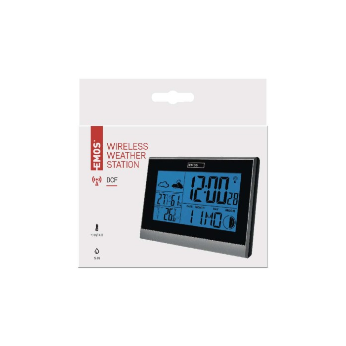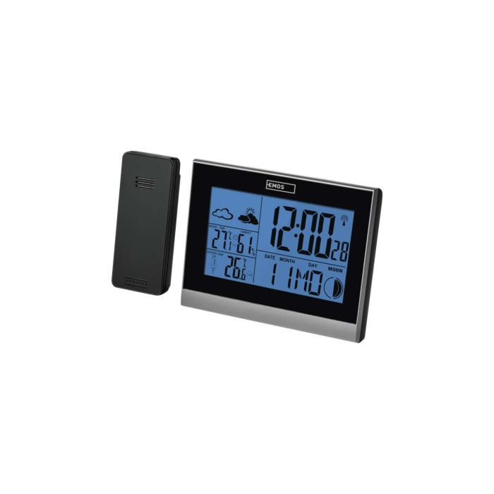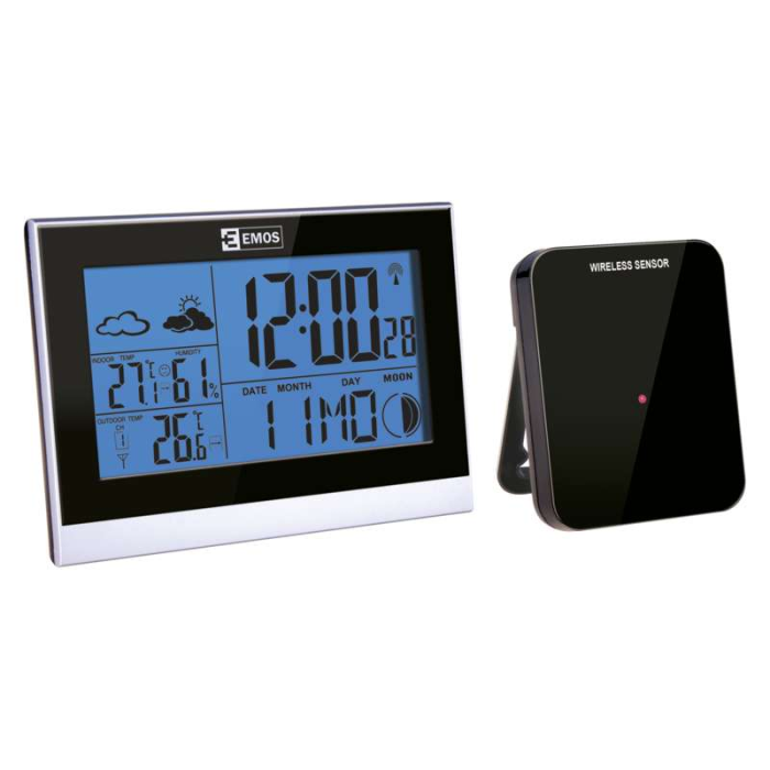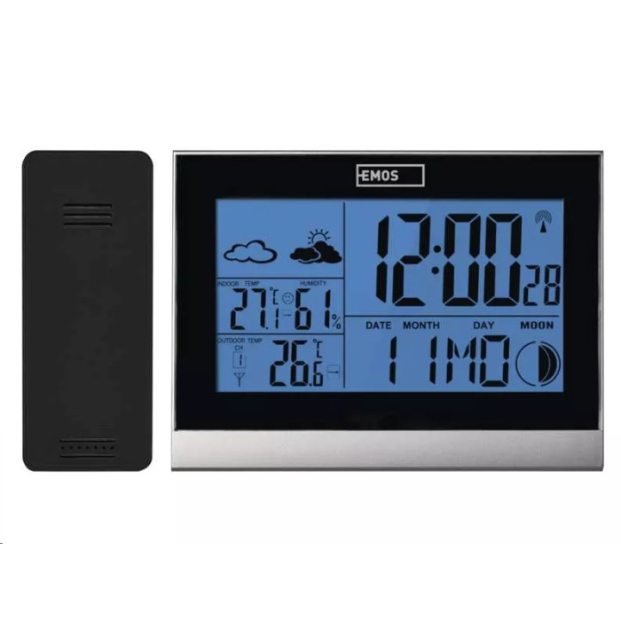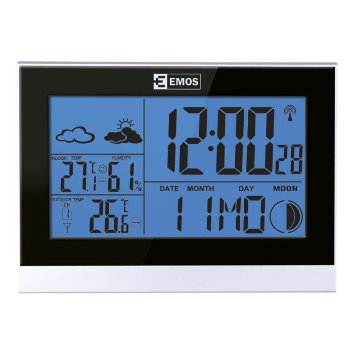 Meteostanice s modře podsvíceným displejem zobrazující hodiny, datum, budík s funkcí opakovaného buzení, předpověď počasí, údaje o vnitřní a venkovní teplotě, vnitřní vlhkosti, fázi měsíce.