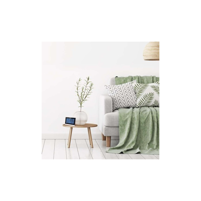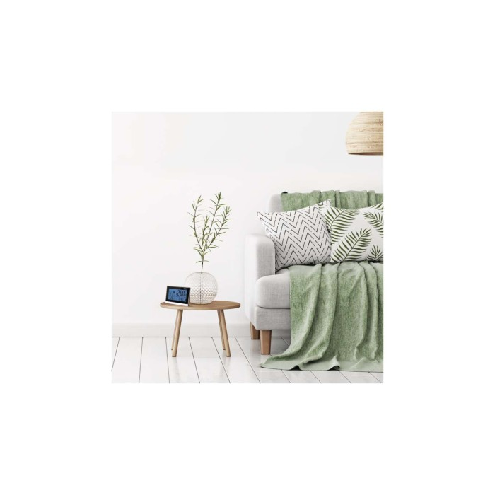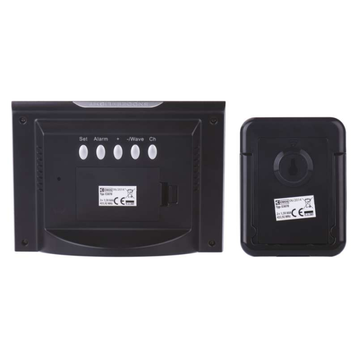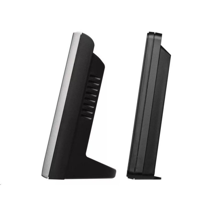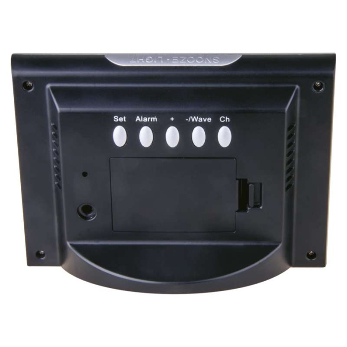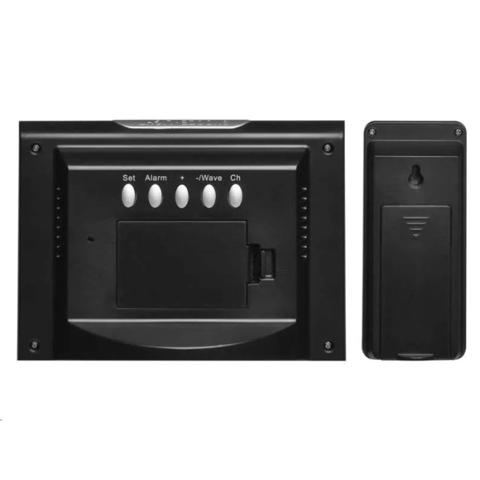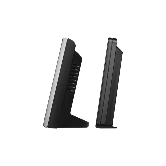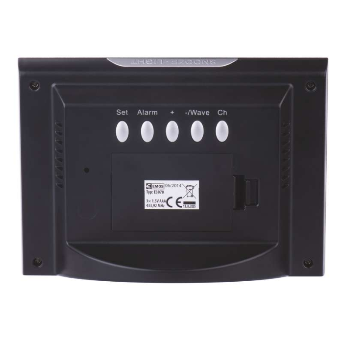Meteostanice s modře podsvíceným displejem zobrazující hodiny, datum, budík s funkcí opakovaného buzení, předpověď počasí, údaje o vnitřní a venkovní teplotě, vnitřní vlhkosti, fázi měsíce.