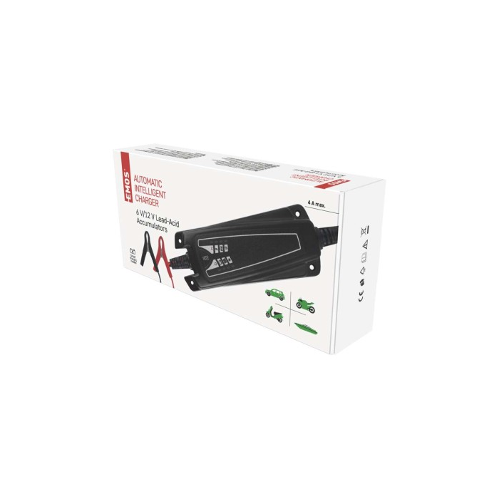Inteligentní nabíječka EMOS N1014 určená pro automobily, motocykly, záložní akumulátory. Nabíjí olověné aku WET (kyselinové), MF (bezúdržbové), záložní akumulátory VRLA, AGM i GEL. Nabíjení 6 V (1,2 Ah–14 Ah), 12 V (1,2 Ah–120 Ah).
