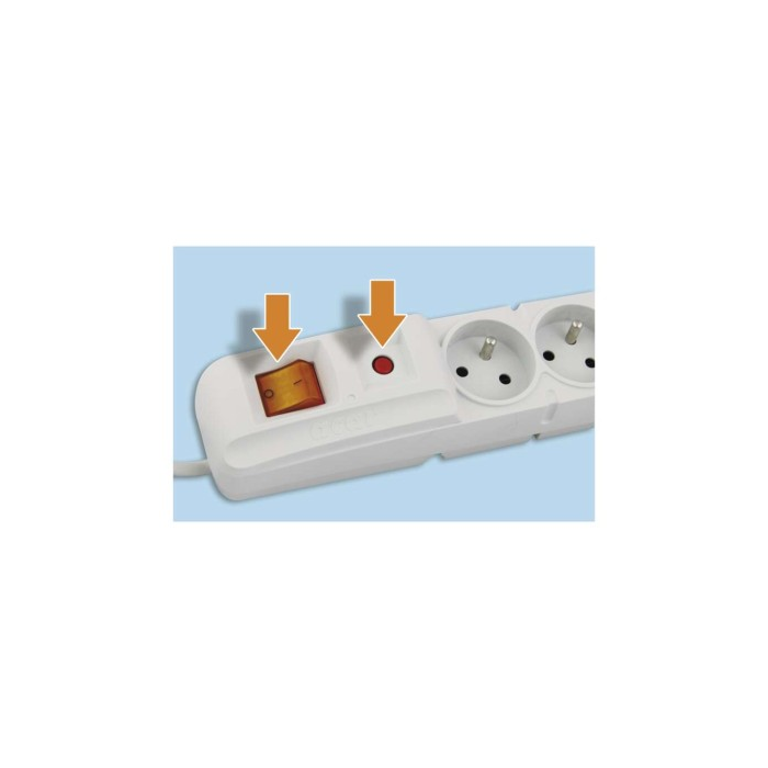 Přepěťová ochrana, 5 zásuvek, 10 A/250 V, podsvícený síťový vypínač, automatická pojistka s časovým zpožděním, 4 možné směry uspořádání síťového přívodu.