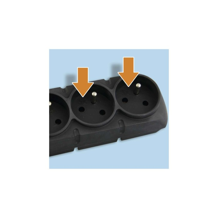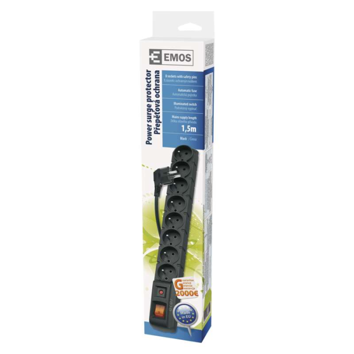 Přepěťová ochrana s 8 zásuvkami, 10A/250V, délka 1,5 m, podsvícený síťový vypínač, automatická pojistka s časovým zpožděním.