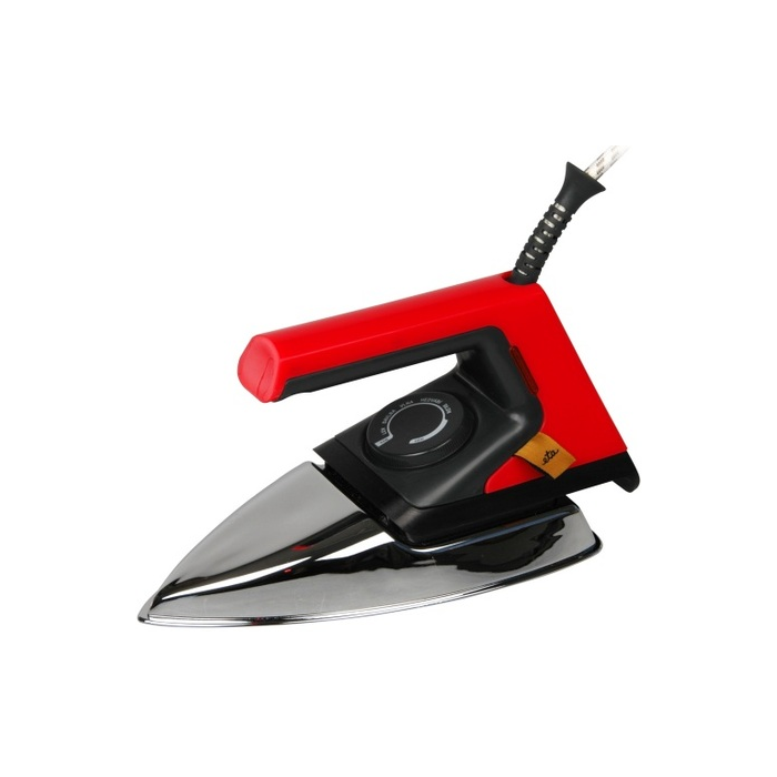 suchá, příkon 1000 W, nerezová žehlicí plocha, plynulá regulace teploty, světelná signalizace dosažení teploty, otevřené držadlo, barva červená