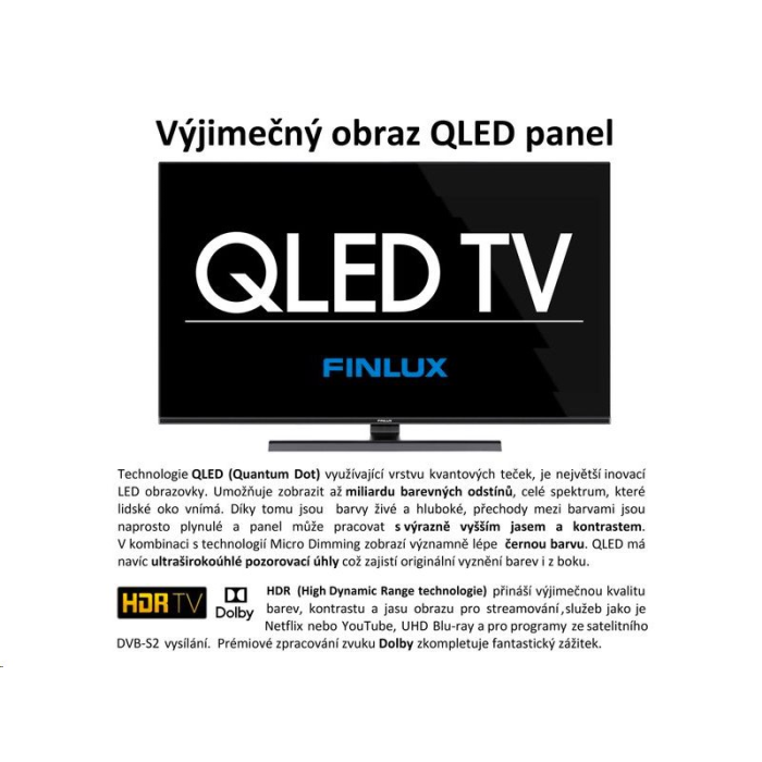QLED panel místo obyčejného LED - lepší jas (až cca 550 cd/m²), věrnější barvy a stabilní obraz i při pohledu ze strany.