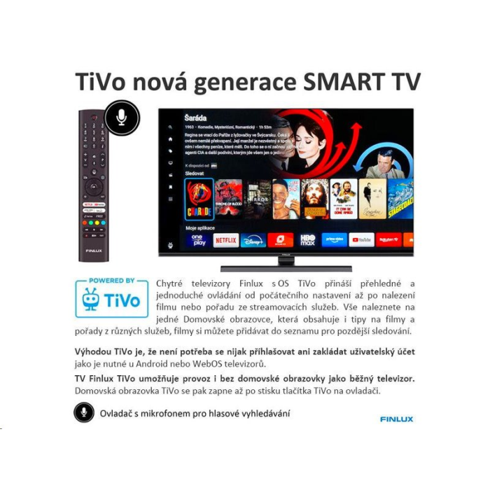 | Smart TV | Ano (OS TIVO) | Přístup k internetu, aplikacím a streamovacím službám. |