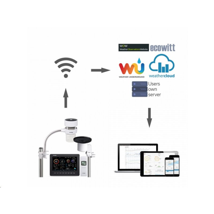 • Přenos dat naměřených bezdrátovými čidly na server webové služby Weather Underground, Weathercloud, Weather Observations Website a/nebo Ecowitt Weather.