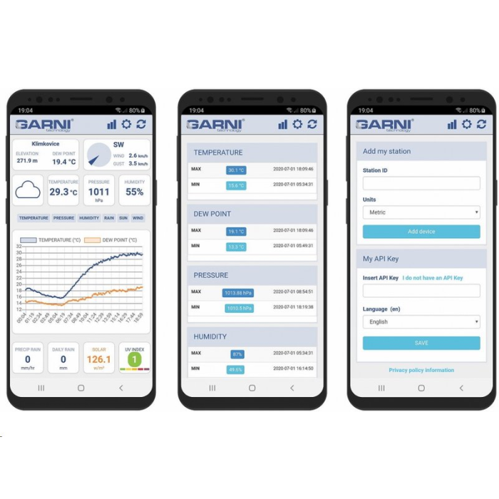 Model GARNI 3055 Arcus, shromažďuje přesné a podrobné údaje o počasí, které následně automaticky pomocí Wi-Fi nahrává na webové stránky Weather Underground, Weathercloud, Weather Observation Website a/nebo Ecowitt - známé meteorologické služby, které umožňují pozorovatelům počasí odesílat své místní údaje o počasí, ke kterým mohou následně odkudkoliv přistupovat. Pokročilí uživatelé mohou využít možnosti nahrávat naměřené hodnoty přímo na svůj vlastní server.
