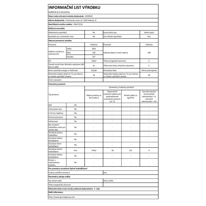 194 l, 5 zásuvky, LED osvětlení, 9kg/24 hod., energetická třída E, 43 dB, 219kWh/rok, bílá; Rozměry V x Š x H(cm): 169,1 x 55 x 55,7
