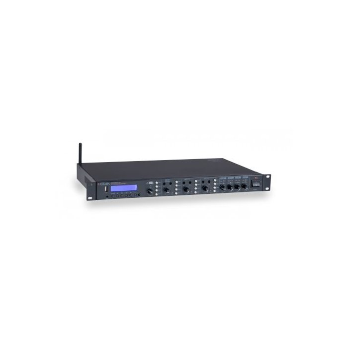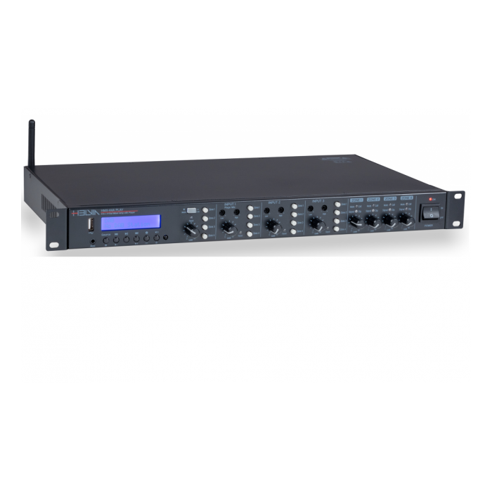 HELVIA has thought to respond to the main needs of those involved in small-to-medium audio installations offering versatility and compactness in an integrated solution such as the HMX-44A. This is a little gem that integrates a matrix with a 4-input, 4-output mixer, a multimedia player and four independent 60W amplifiers. A passive version is also available, without the 4 amplifiers, to be combined with external power amplifiers if necessary in case of large installations. The mixer section provides 3 combo Mic-Line inputs with 48V Phantom, a front mini-jack stereo Line input combined with the multimedia player with DAB+, FM, USB, BT. Each input has independent level adjustment, and the 3 combo Mic/Line inputs also possess high and low tone adjustment. All 4 inputs are assigned independently to the 4 zones, and each zone has output level control. The HMX-44A provides connection with HMX-MIC microphone base station via RJ-45 connection. The station is equipped with alert chimes and allows the 4 zones to be selected independently. The 60W Class-D amplifier modules integrate digital processing with limiter, overheat protection, fan control, DC-offset and in-current to ensure operation at any audio level at both 70V/100V and 4 ohms in complete safety.