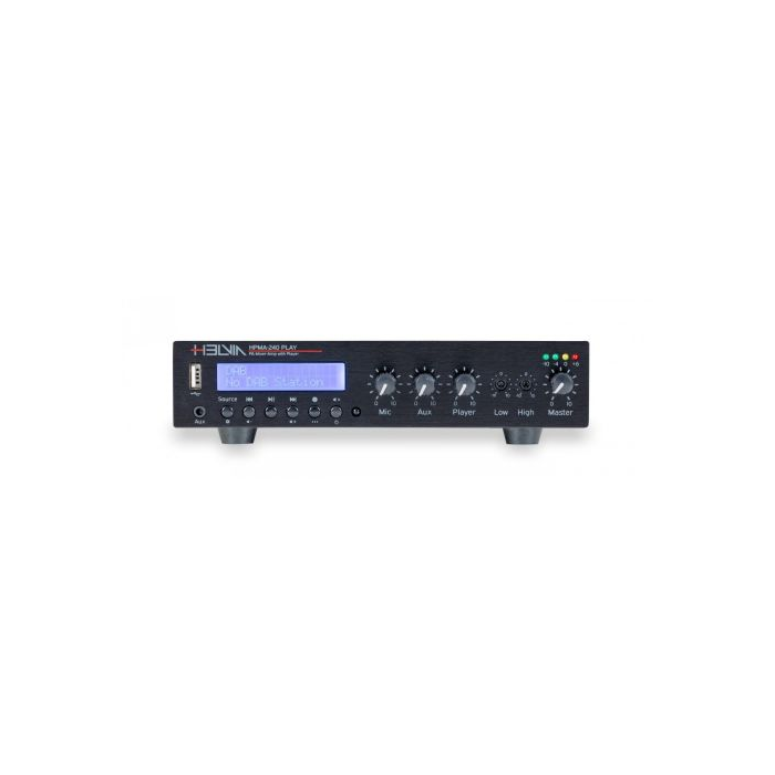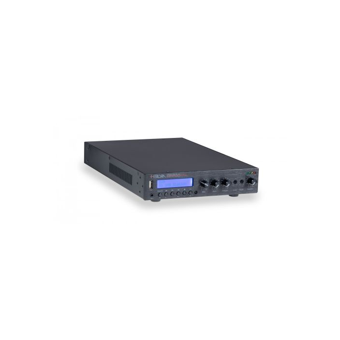 Sound system installations for commercial applications, while requiring more and more versatility and high performance in terms of power and sound pressure, have increasingly limited space. HELVIA is well aware of these requirements and offers a line of single-zone mixer-amplifiers in standard ½ 19" rack unit format with power ratings ranging from 30W to 240W, capable of operating on both 70V/100V and low impedance lines up to 2 ohms with maximum stability (2-ohm operation is provided only for 120W and 240W models; for 30W and 60W models the minimum limit is 4 ohms). The HPMA series - where "P" stands for Pocket - integrates a mixer with 1 Combo Mic/Line input with 48V Phantom, a front AUX input with stereo mini-jack plus a rear stereo AUX RCA input, and a Multimedia Player with DAB+ and FM tuner, USB player and BT; the level of each input is independently adjustable from the front panel. The Class-D amplifier modules integrate digital processing with limiter, overheat protection, fan control, DC-offset and in-current to ensure operation at any high impedance audio level down to a minimum of 2 ohms* in complete safety. HPMA-Play series amplifiers can be rack mounted with the optional HPMA R1-Kit mounting kit.