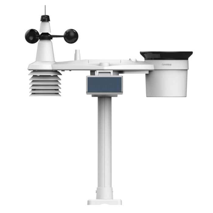 Integrované bezdrátové čidlo 7-v-1 GARNI 1NG měří vnější teplotu a relativní vlhkost, rychlost a směr větru, dešťové srážky, UV index a sluneční záření, a data jsou odesílána do hlavní jednotky až do vzdálenosti 150 m (v otevřeném prostoru).