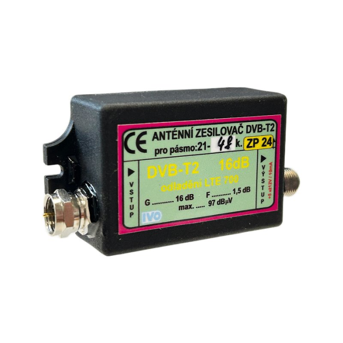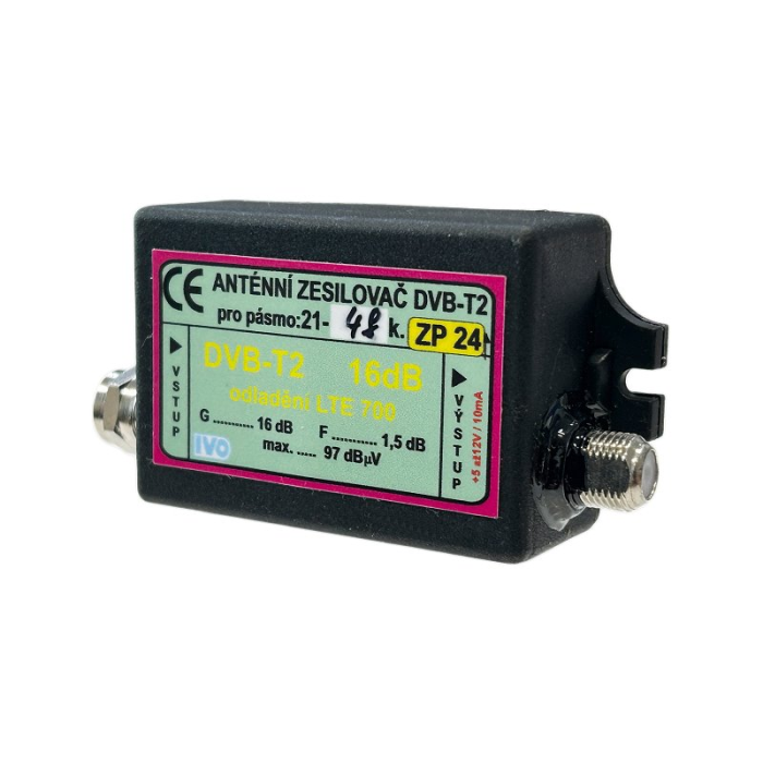 Nízkošumový 5G LTE DVB-T2 předzesilovač 16 dB pro 21.-48. kanál s odlazením -30 dB. Je přesně laděný - žádná sériová výroba. Určený k vnitřnímu použití.