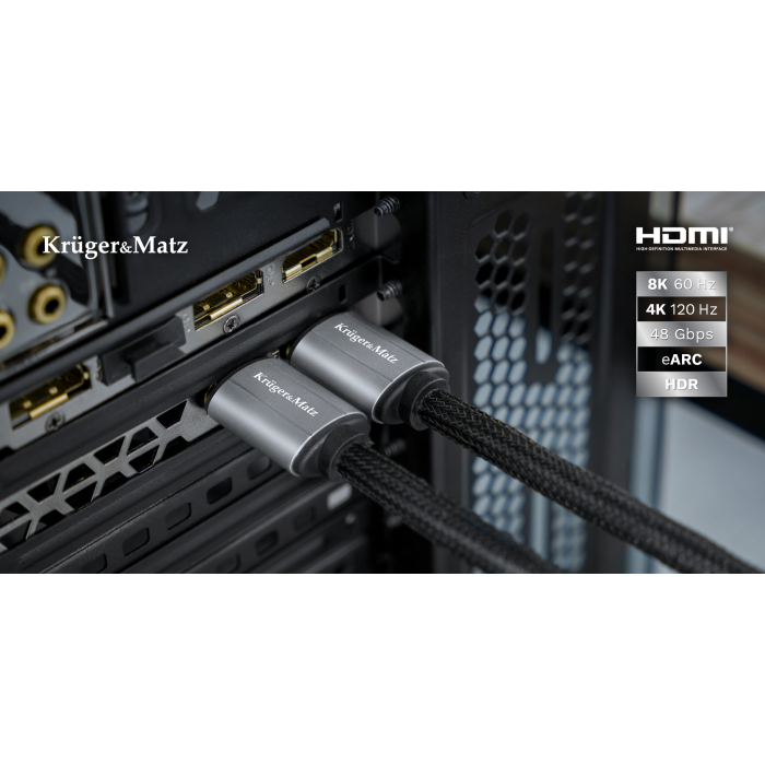Kabel HDMI 2.1 od společnosti Kruger&Matz umožňuje zobrazovat obraz v rozlišení 8K při 60 Hz a v rozlišení 4K při 120 Hz. Přejděte na zcela jinou úroveň zážitků při sledování filmů a hraní her na vaší konzoli.