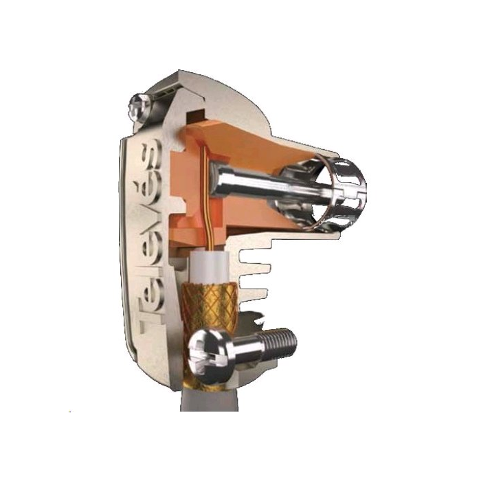 Profesionální IEC konektor od výrobce Televes. Zaručuje nejvyšší kvalitu spojení a stínění. Jistota 100% kvality práce. Kompatibilní s širokou škálou průměrů koaxiálních kabelů (5 ... 7,5 mm).