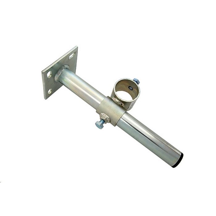 Držák pro upevnění stožáru o průměru 42 mm s jedním zajišťovacím šroubem stožáru a jedním zajišťovacím šroubem pro zajištění vysouvané části s odsazením 10 až 450 mm od zdi či krovu a možností natočení.