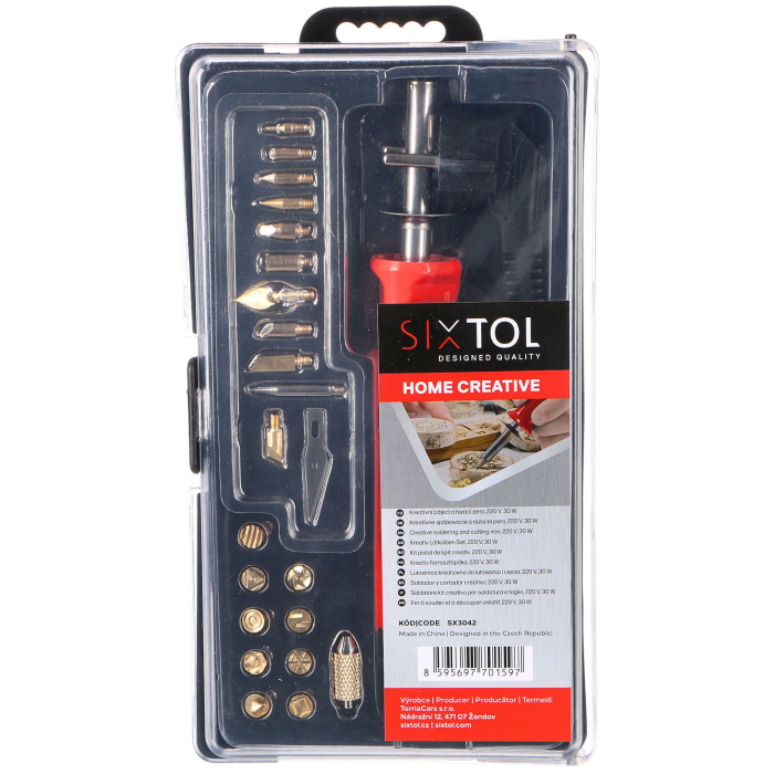 Multifunkční kreativní pájecí a řezací pero SIXTOL HOME CREATIVE s výkonem 30 W a bohatým příslušenstvím. Výkon 30W. Použití pro dřevo, kůže, vosk, plast, textil nebo korek