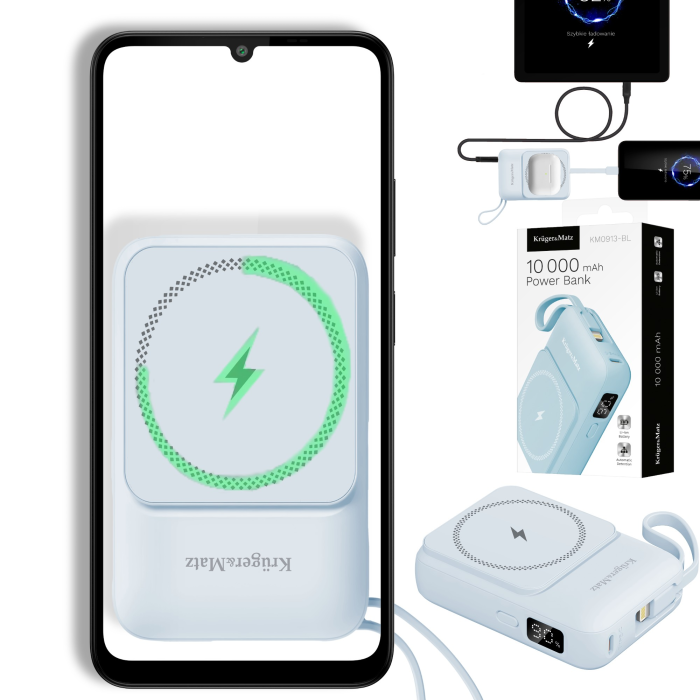 Objevte powerbanku KRUGER & MATZ KM0913-BL, která kombinuje moderní bezdrátové nabíjení s MagSafe kompatibilitou a vysokou kapacitou 10 000 mAh. Tento elegantní modrý přenosný zdroj energie je ideální pro všechny, kteří hledají spolehlivost a rychlost při nabíjení svých zařízení na cestách.