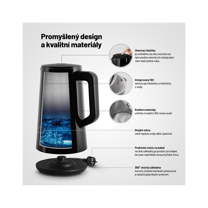 Rychlovarná konvice, 1,5 l, 1800 W, nastavitelná teplota 40 °C, 60 °C, 85 °C, 90 °C a 100 °C, funkce Keep Warm, dvojité stěny pro bezpečné použití a ekonomičtější provoz, velký LED displej, dotykové ovládání, pojistka proti přehřátí a vaření nasucho, integrovaný filtr, otočná základna