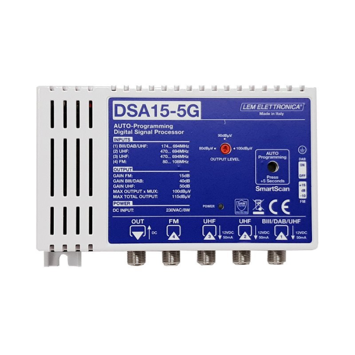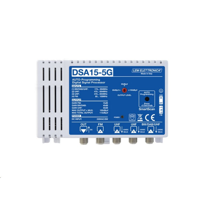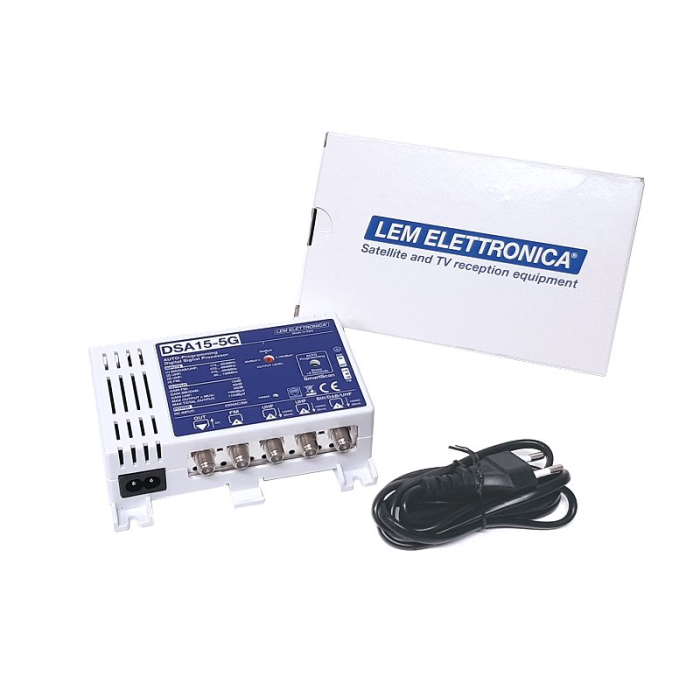 LEM DSA15-5G SMART 5G zesilovač pro DVB-T2/DAB+/FM vysílání určený pro malé rozvody (ITR). Připojíte antény (max. 4) a zesilovač jednotlivé kanály srovná na stejnou úroveň. Plug & Play instalace.
