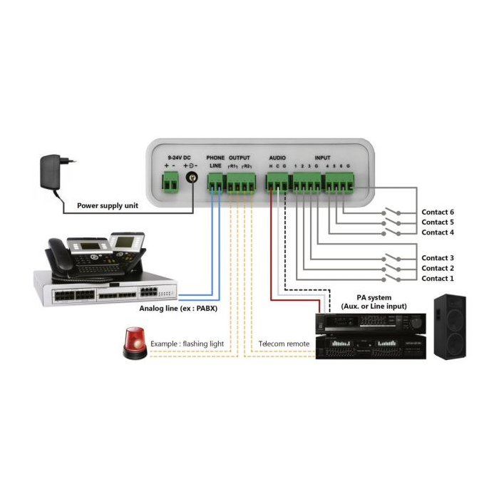 Description: PA telephone announcement adapter Colour: white Suitable for: telephone system Power supply: via encl. power supply Admiss. ambient temp.: 0-40 °C Dimensions: 126 x 40 x 110 mm Weight: 310 g Connections: screw terminals and mini USB Packing unit: 1 Packaging dimensions (W x H x L): 0.17 x 0.225 x 0.055 m Gross weight: 0.508 kg Net weight: 0.42 kg